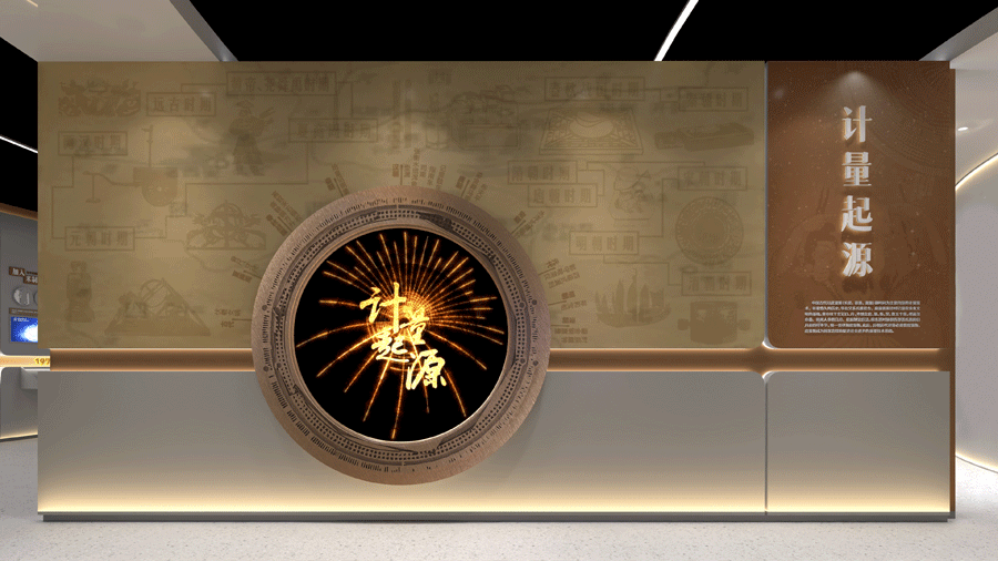 展館的序幕,從計(jì)量的起源緩緩拉開(kāi)。中華古往今來(lái)的計(jì)量文化,如同一幅幅歷史畫(huà)卷,訴說(shuō)著計(jì)量的本質(zhì)與重要作用。墻面設(shè)計(jì)上,不同歷史時(shí)期的計(jì)量發(fā)明被精心挑選,化作一幅幅生動(dòng)的背景畫(huà)面,而中央則鑲嵌著一枚日晷造型的圓形觸控屏。觀眾只需輕輕一觸,便能穿越時(shí)空,點(diǎn)選不同的歷史時(shí)期,借助先進(jìn)的結(jié)構(gòu)投影技術(shù),背景墻上便會(huì)上演一幕幕對(duì)應(yīng)的計(jì)量發(fā)明與文化故事,讓人仿佛置身于那段輝煌的歷史之中。