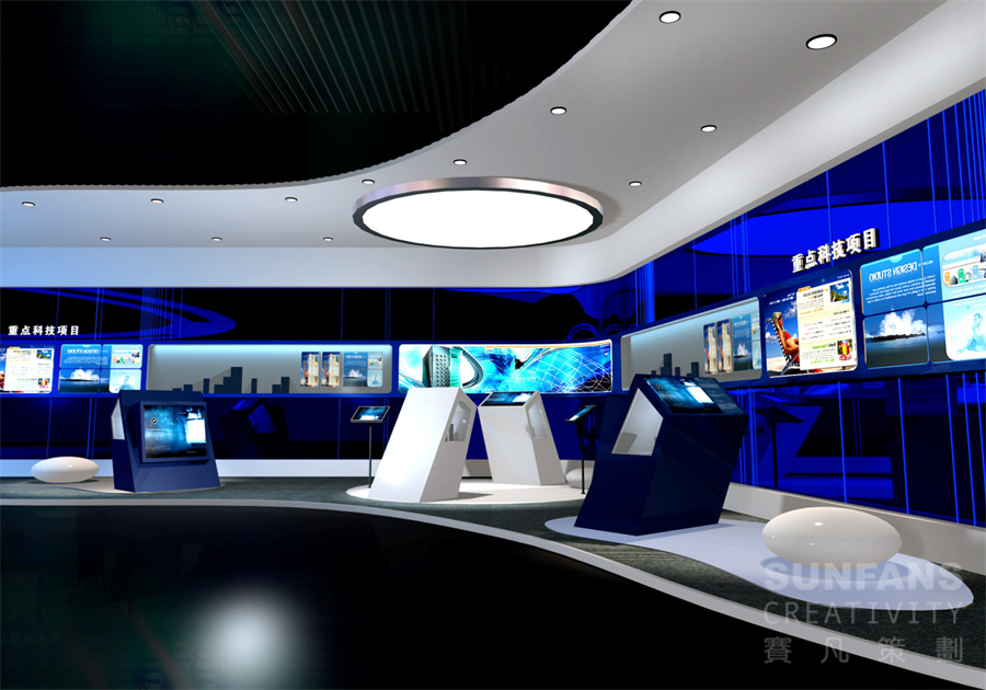 科技園展廳設計要注重長遠規(guī)劃,賽凡設計力求打破傳統(tǒng)企業(yè)展示風格,更加注重展廳的體驗感和互動性,應用了較多的高科技手段,綜合以多媒體影像、燈箱、模型、浮雕等手段,結合展示內(nèi)容,營造出了科技、現(xiàn)代的展示風格。