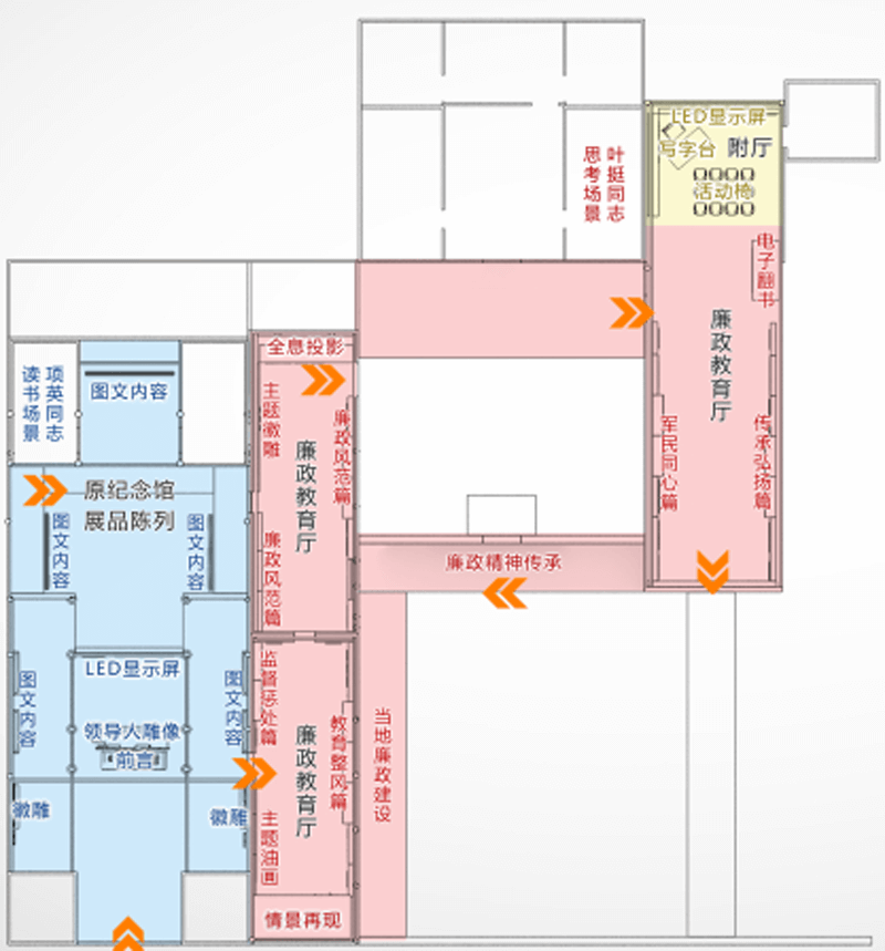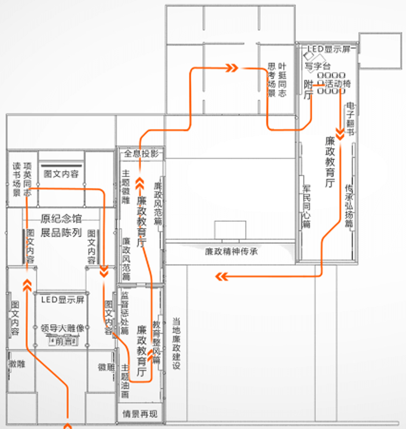 參觀線路:參觀路線設(shè)定從教育館的正門入口進(jìn)入,順時(shí)針依次參觀雕像、LED屏幕、原紀(jì)念館展品、廉政教育廳和廉政精神傳承、當(dāng)?shù)亓ㄔO(shè)等內(nèi)容。