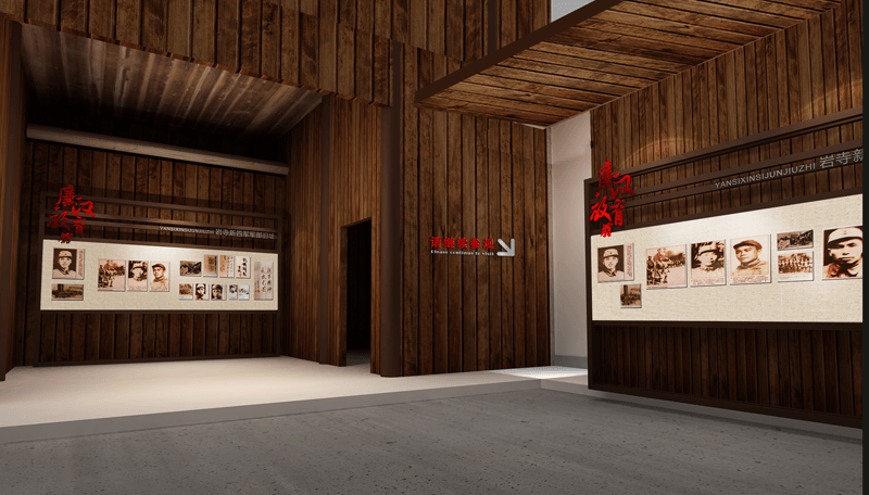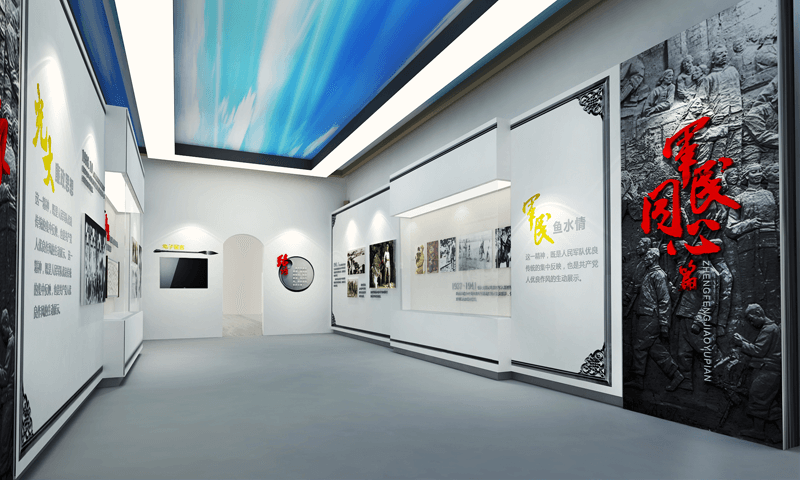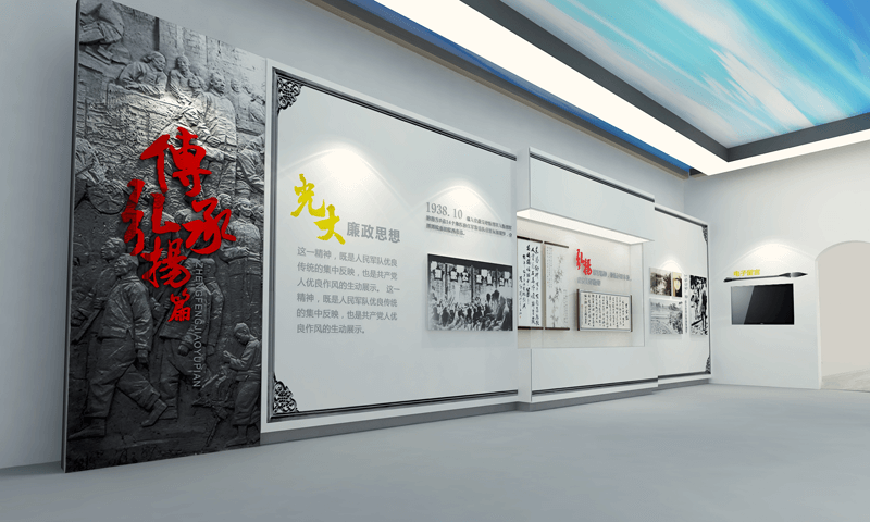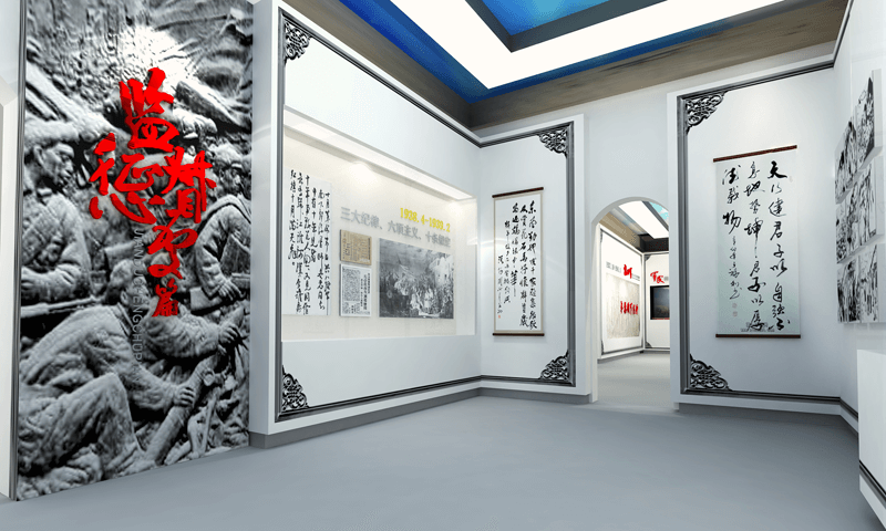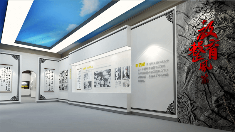 展廳設(shè)計(jì)的整體色調(diào)取自徽派建筑的灰白,加入象征軍魂的紅色,即蘊(yùn)含了藝術(shù)創(chuàng)意美學(xué),又表現(xiàn)出新四軍“一清二白”的崇高思想境界,和廉潔自律的鐵軍精神。