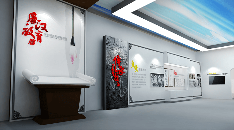 平面布局:根據(jù)古建筑的現(xiàn)場(chǎng)情況進(jìn)行設(shè)計(jì),更充分、合理的利用展示空間。將紀(jì)念館的前院作為序廳,前廳展示了新四軍將領(lǐng)雕像及將領(lǐng)生平的圖文內(nèi)容,并設(shè)置了大型的LED屏幕。后廳將原紀(jì)念館的內(nèi)容加以整理編排,做集中展示。三間大屋用作廉政教育館,前兩間展示教育整風(fēng)篇和監(jiān)督懲處篇,后面一間展示軍民同心篇和傳承弘揚(yáng)篇。連接前后屋的過廊,分別展示了廉政精神傳承及徽州區(qū)政府廉政建設(shè)的重要活動(dòng)等內(nèi)容,并在廉政教育廳內(nèi)設(shè)置了附廳。