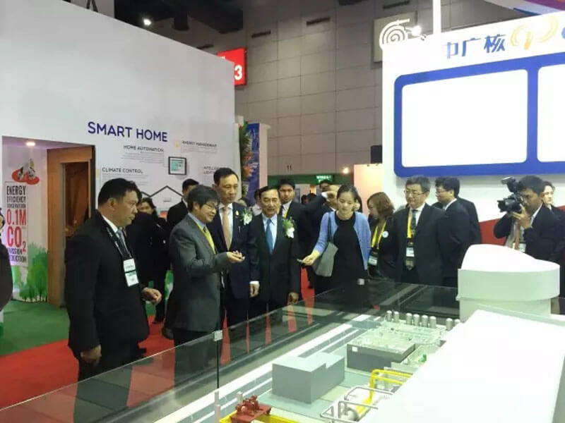 在中廣核展臺(tái),胡文泉向泰國能源部長AnantapornKanchanarat介紹了中廣核在核電、風(fēng)電、太陽能等清潔能源業(yè)務(wù)的發(fā)展情況和中廣核的全球化市場推廣情況,當(dāng)?shù)弥袕V核不僅有核電還有其他風(fēng)電等清潔能源時(shí),他產(chǎn)生了濃厚的興趣。他還主動(dòng)問起了此前泰國RATCH電力公司參股建設(shè)的防城港核電二期項(xiàng)目,詢問了項(xiàng)目的詳細(xì)地理位置和項(xiàng)目進(jìn)展,胡文泉邀請(qǐng)他到防城港項(xiàng)目參觀,他爽快地點(diǎn)頭答應(yīng)。在中國自主三代核電技術(shù)“華龍一號(hào)”的技術(shù)模型前,部長詳細(xì)詢問了華龍一號(hào)的技術(shù)特征和國際市場推廣情況,并表示歡迎中廣核今后能更深度地參與泰國市場的清潔能源合作。